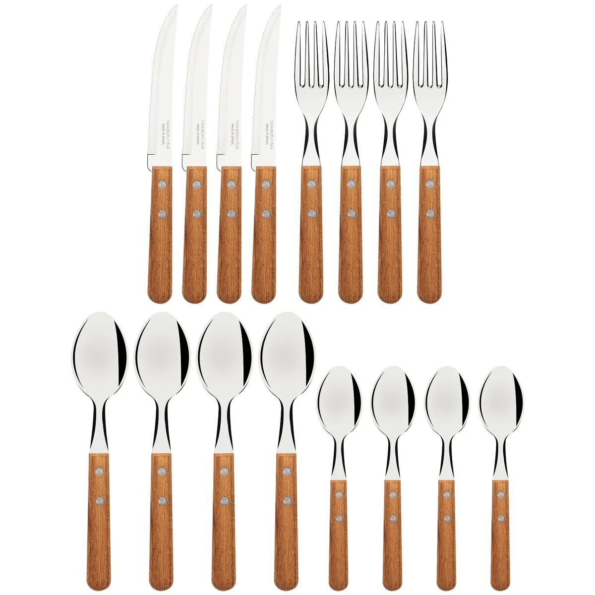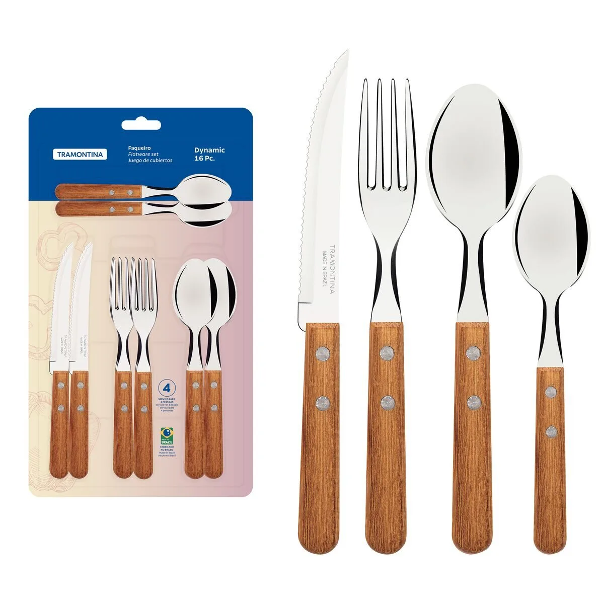 El juego de cubiertos Tramontina Dynamic de 16 piezas con hojas de acero inoxidable y mangos de madera natural es la opción ideal para acompañar tus comidas principales. Compuesto por cuchillos, tenedores y cucharas con hojas de acero inoxidable y mangos de madera natural con remaches de aluminio, es un juego de cubiertos resistente y duradero. Sus cuchillos garantizan un excelente filo, y sus tenedores y cucharas cuentan con un estampado especial que les proporciona resistencia y durabilidad. ¡Los cubiertos son muy fáciles de limpiar y te harán más práctico el día a día!