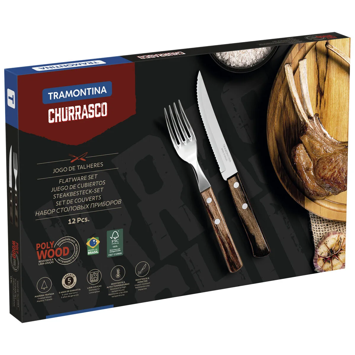Para un buen chef de barbacoa, cada momento es precioso, desde la preparación hasta el servicio. Y para que la reunión sea aún mejor, la opción ideal es el Juego de Cubiertos para Barbacoa Tramontina de Acero Inoxidable con Mangos de Polywood Marrón, 12 Piezas. La línea Churrasco incluye tenedores y cuchillos en este hermoso juego, fabricados con hojas de acero inoxidable que garantizan una alta durabilidad, y mangos de madera tratada con Polywood, que ofrecen resistencia a impactos y altas temperaturas. Estas piezas embellecerán aún más su mesa, además de hacer que el momento de disfrutar de una deliciosa barbacoa sea aún mejor.
