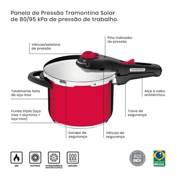 | Informaciones Generales | Olla a Presión Tramontina Solar con presión de trabajo 80/95 kPa. Todos los atributos del acero inoxidable con la agilidad y rendimiento que solo una olla a presión puede ofrecer. Además de prácticas, las ollas a presión Tramontina son sumamente seguras. Fabricado íntegramente en acero inoxidable, por lo que no suelta ningún residuo en los alimentos, manteniéndolos sanos. De gran durabilidad, mantiene las características originales, conservando la belleza, higiene y durabilidad del material. La base triple (acero inoxidable + aluminio + acero inoxidable) distribuye el calor de manera uniforme, proporcionando una cocción más rápida y uniforme, ahorrando energía y manteniendo los alimentos calientes por más tiempo. Asa y cable antitérmicos, que garantizan seguridad y facilidad de manejo. Dispone de 5 dispositivos de seguridad que funcionan de forma integrada. La olla tiene un medidor de capacidad en el interior, lo que facilita el control de la cantidad de comida. Tiene un sistema de descompresión. Está atestiguado por la Norma Nacional de Seguridad. Viene con manual de instrucciones. Se puede utilizar en cocinas: gas, eléctricas, vitrocerámica e inducción. El cocedor de vapor se puede comprar por separado: 62516/500. Junta tórica de repuesto: 62516/970. |