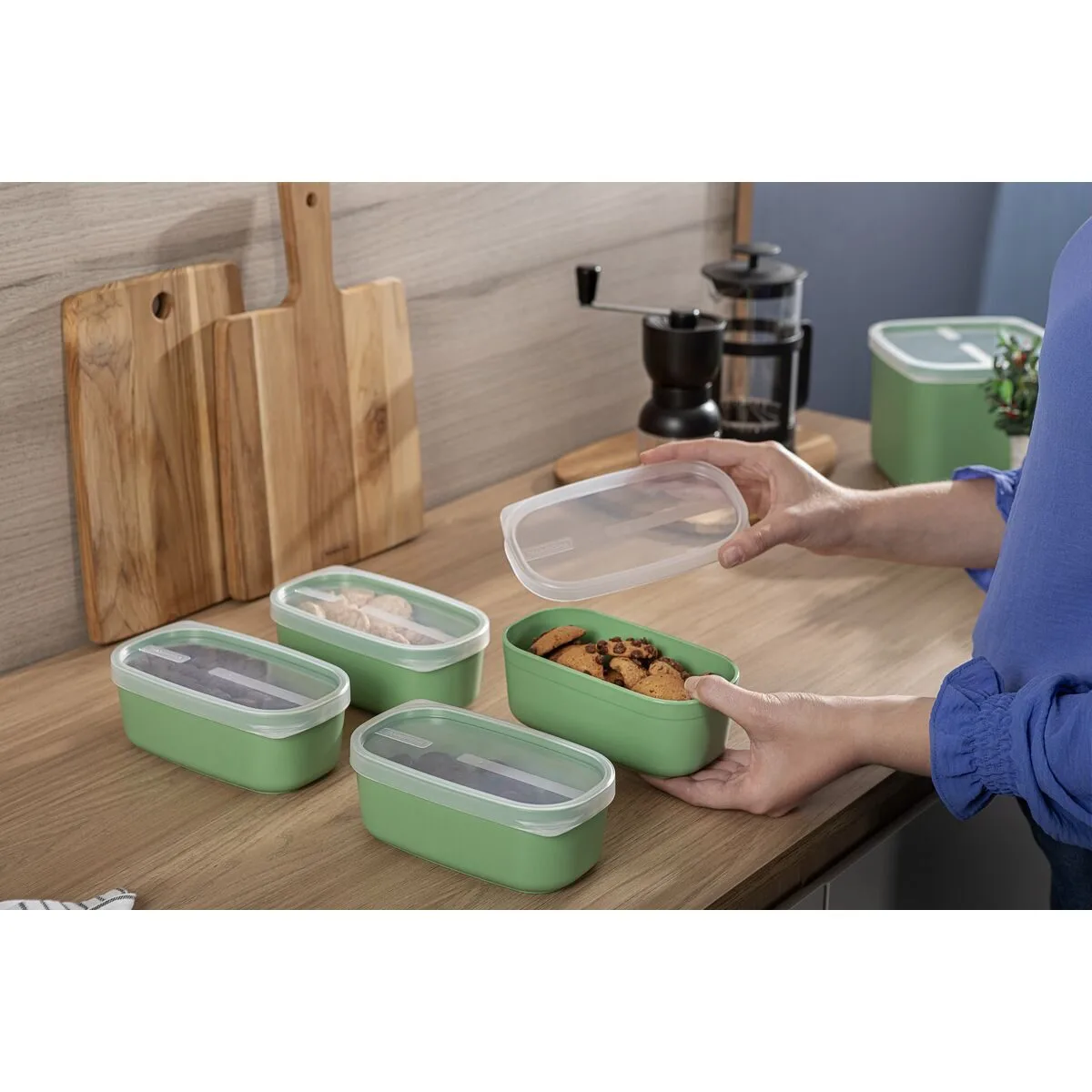 Pote o recipiente MixColor de polipropileno color Verde Salvia con tapa transparente, 650 ml